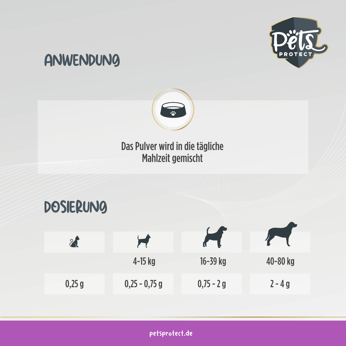 Pets Protect BIO Seealgenpulver ist somit eine rein natürliche und vielseitige Ergänzung zur täglichen Fütterung, die Zahnpflege, Fellgesundheit, Pigmentierung und die allgemeine Vitalität des Tieres unterstützt.
