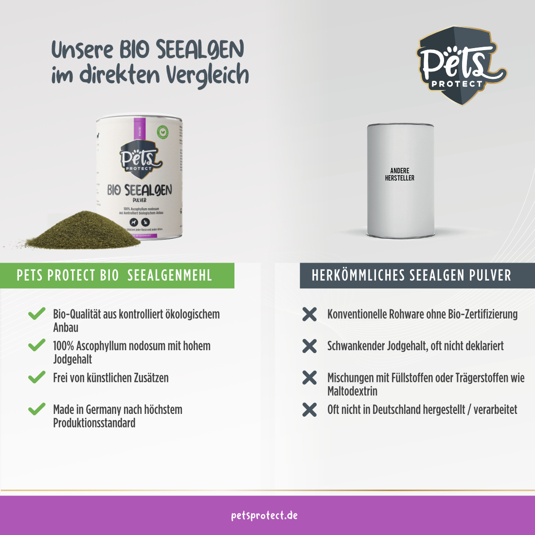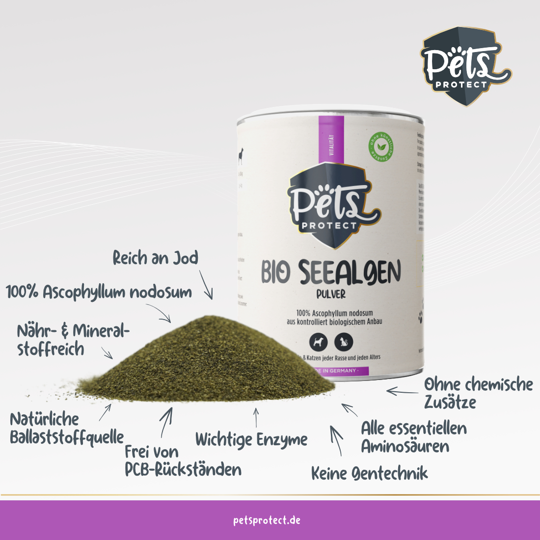 Artikelnummer: pp-1036 Kategorien: Fell- & Hautgesundheit, Vitalität & Gesundheit, Alles für Hunde, Vegan, Gelenkschutz, Alles für Katzen, Fell- & Hautgesundheit, BARF, Gesundheit & Vitaltät, Gelenke & Bewegung, Fell- & Hautgesundheit, Vitalität & Gesundheit, Gelenke & BewegungDas Bio Seealgenmnehl von Pets Protect besteht zu 100 % aus Ascophyllum nodosum aus kontrolliert biologischem Anbau und wird schonend getrocknet sowie fein vermahlen. Es ist frei von Zusätzen und liefert natürliche Nährstoffe in einer Form, die vom Körper von Hund und Katze besonders gut aufgenommen werden kann. Der hohe Gehalt an Jod unterstützt die normale Funktion der Schilddrüse, die für Stoffwechsel, Energiehaushalt und Hormonbalance entscheidend ist.